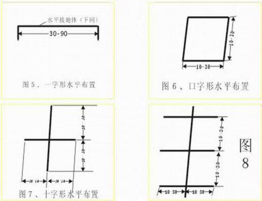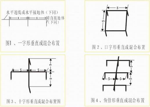 如圖1-4,分一字形、十字形及魚骨形。特別要指出的每根垂直接地體之間的距離不應(yīng)小于5米,否則有屏蔽作用,降低降阻效果,此方法僅在垂直接地體周圍按下圖(垂直接地體的埋設(shè))施用降電阻劑,此法適用于地形狹窄,但能深挖或有條件使用機(jī)械鉆孔的情況。